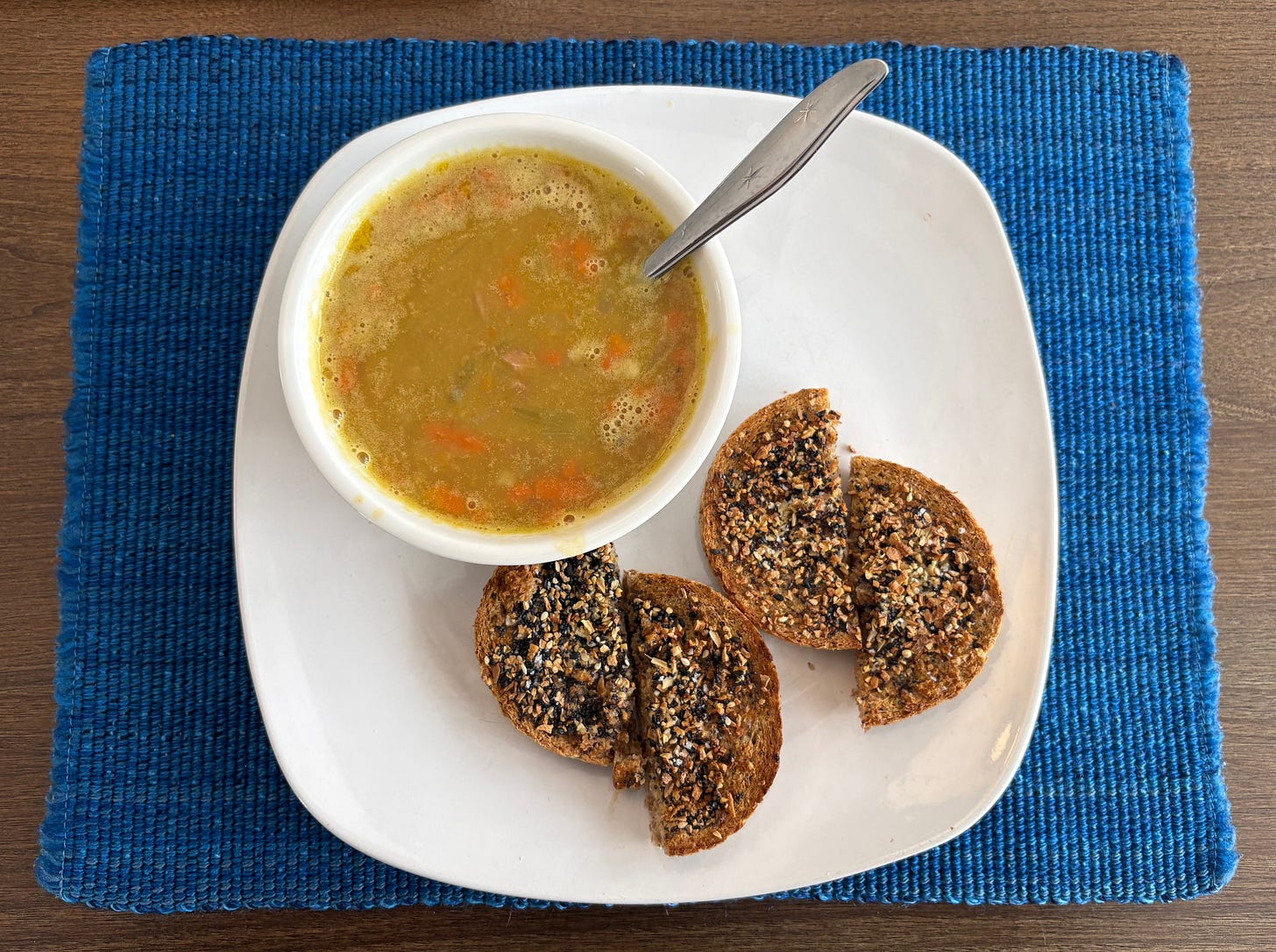 Peel the carrots and onion. Dice the carrots, onion, and celery. Peel and mince the garlic. In a large Dutch oven or stockpot, heat 2 tablespoons olive oil over medium heat. Add the carrots, onion, celery, and garlic. Sauté for five minutes until the vegetables are tender. Add the smoked turkey leg, dried split peas, water, thyme leaves and bay leaf. Stir and cover. Heat to a boil and reduce heat to medium-low. Simmer for one hour with the lid off or set askew so steam can escape. When the peas have broken apart and soup is thick it’s ready. If the soup is too thick, add additional water one cup at a time. Remove turkey leg and let it cool until you can handle it. Pull meat off the bone and dice or shred it into bite-sized pieces. Stir in the turkey and heat through. Season with salt and pepper to taste. Serve.