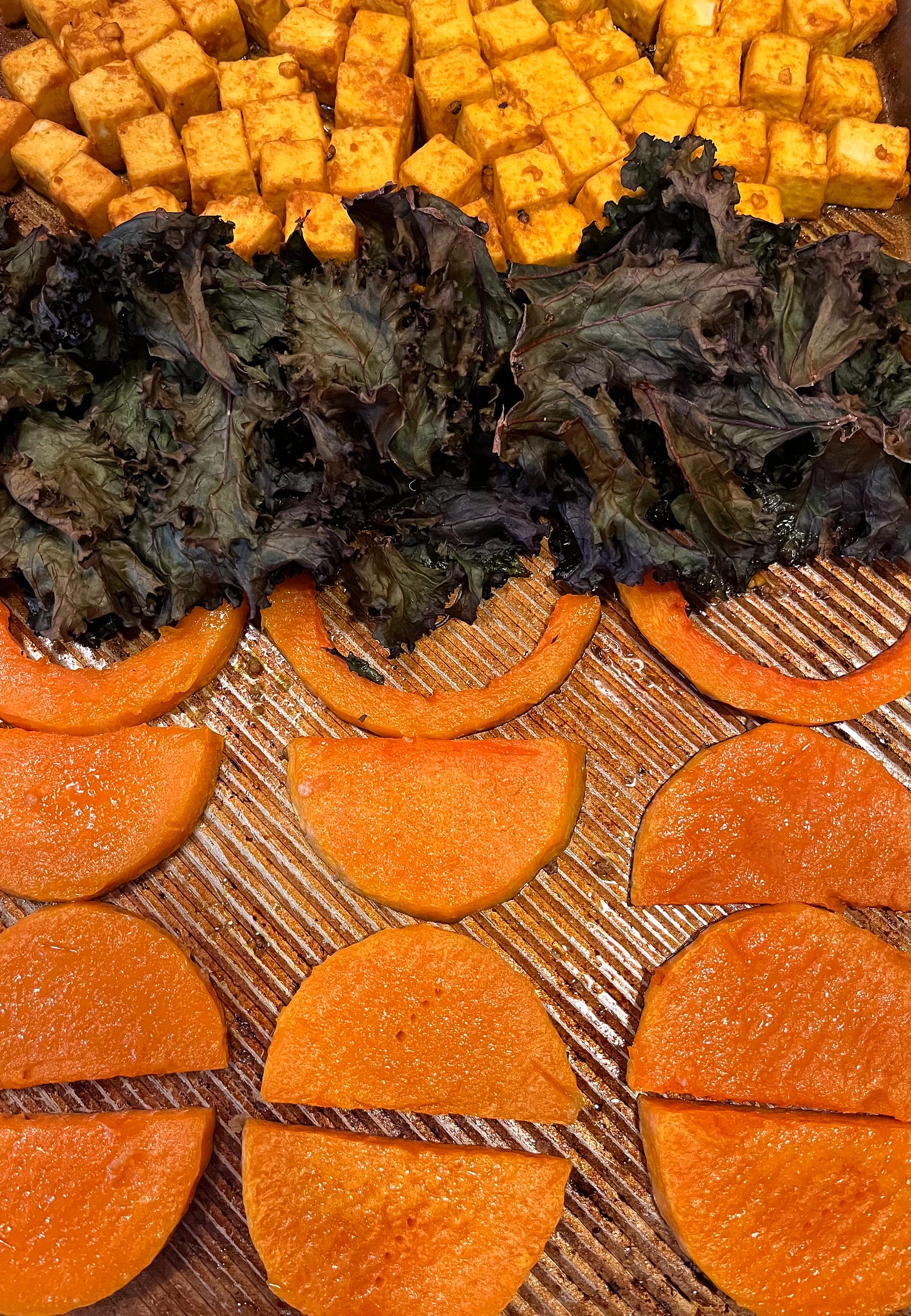 Preheat the oven to 350 degrees. Peel and slice the butternut squash in moons. Cube the tofu. Wash and chop the kale to bite size pieces. Drizzle 1 tablespoon of oil over the baking tray / sheet. Add the squash and sprinkle with 1/3 of the salt and pepper. Add the kale and sprinkle with the next 1/3 of the salt and pepper. Add the tofu and sprinkle with the last 1/3 of the salt and pepper and turmeric. Drizzle the remaining 1 tablespoon of oil over the top of the traybake items and toss them in groups to coat with oil and seasoning. Bake for 20-30 minutes until the squash is tender and the kale is crisp.